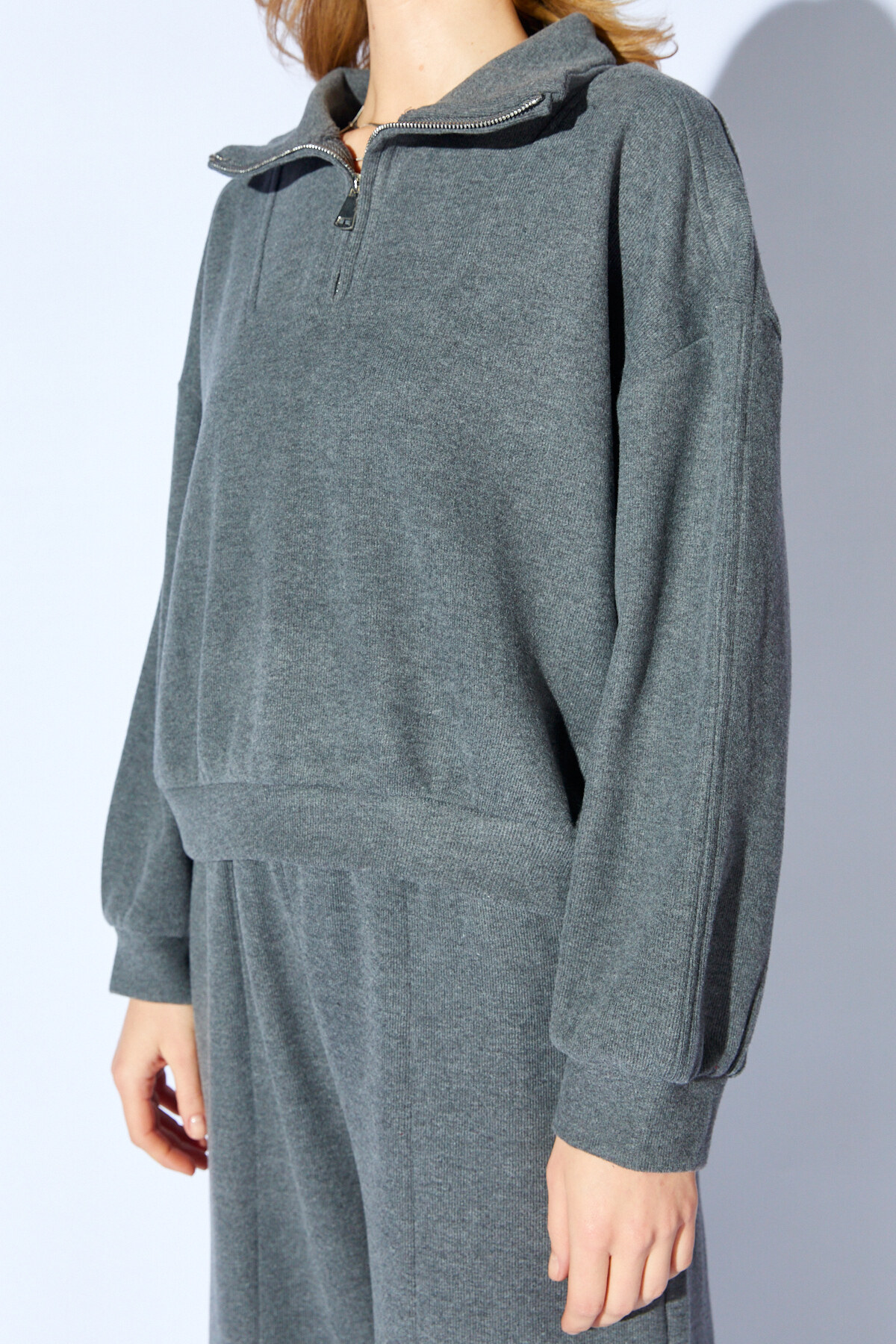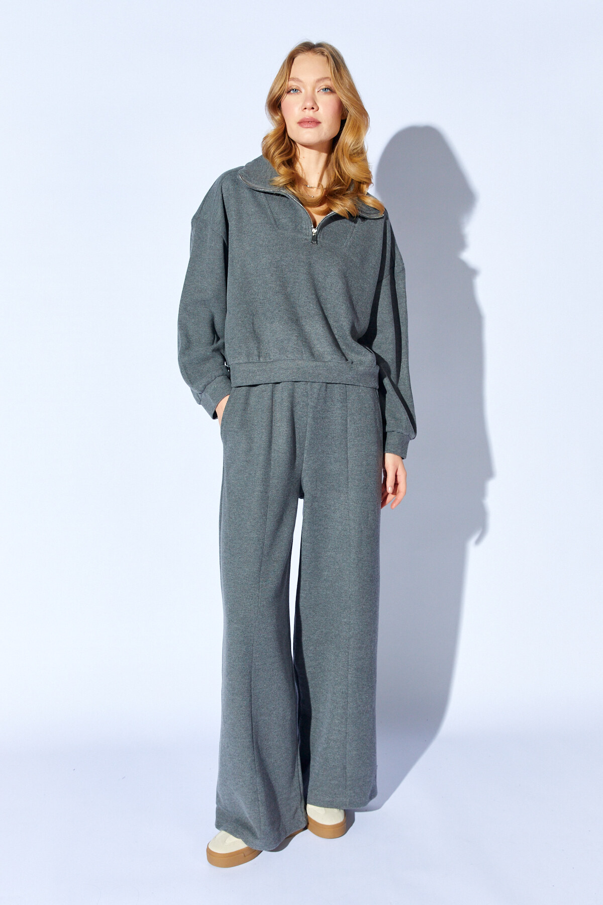 Gri Melanj Yarım Fermuarlı Sweatshirt-Beli Lastikli Kordon Detaylı Pantolon Takım | MKW185498-01