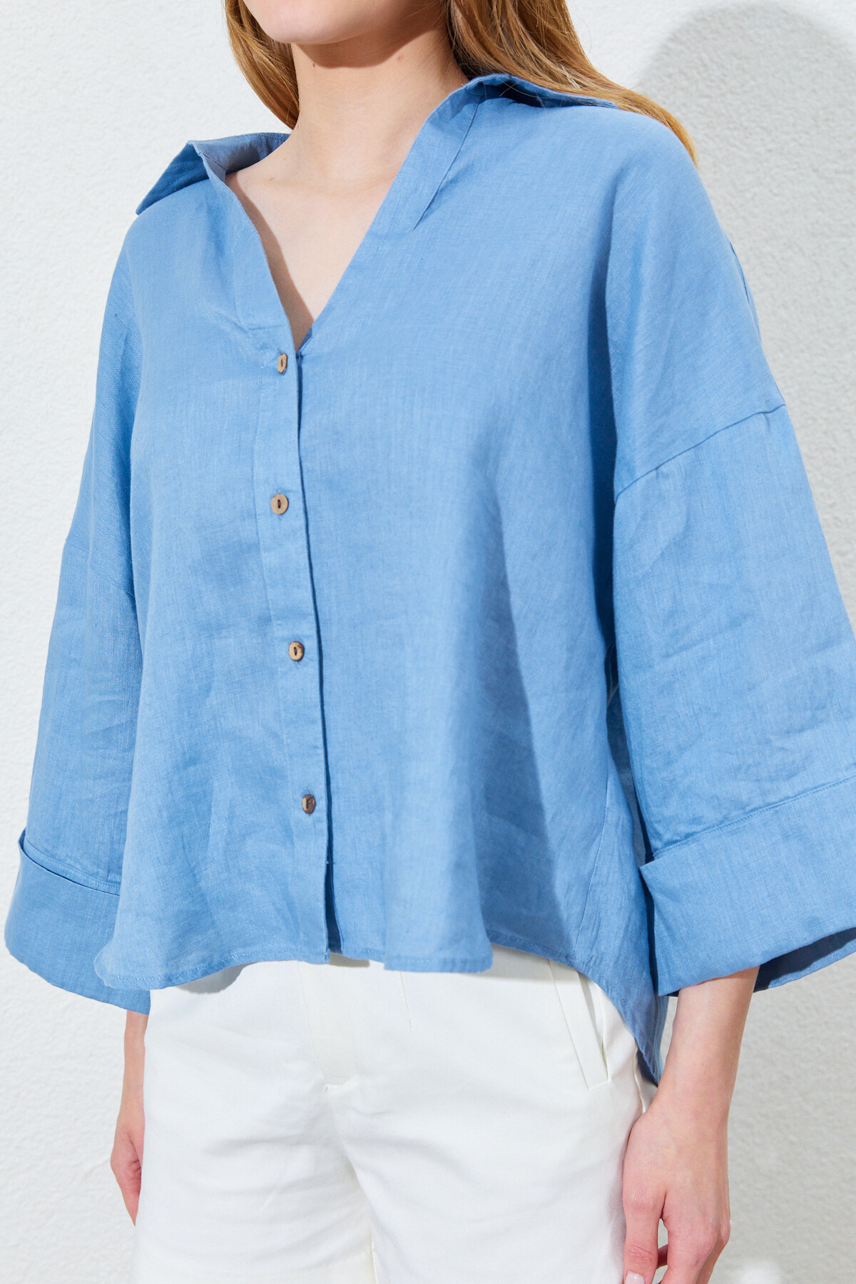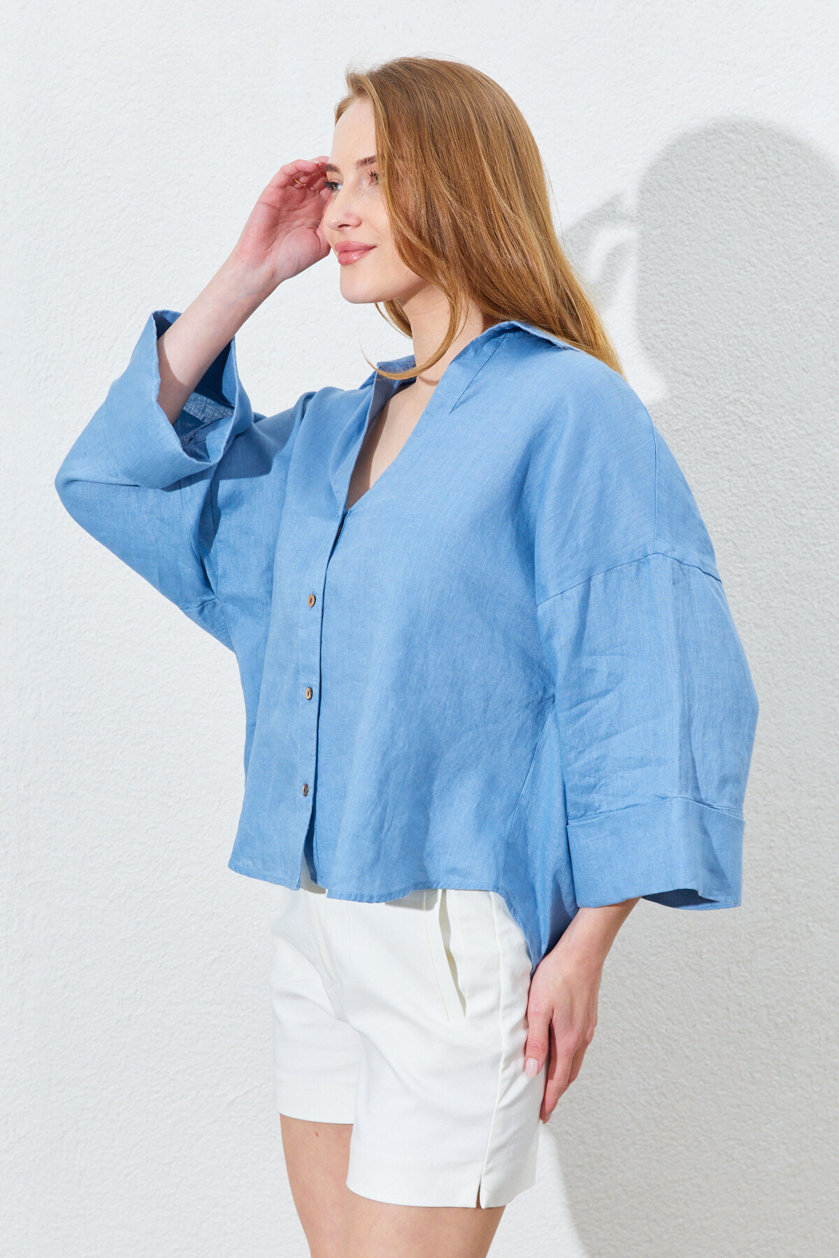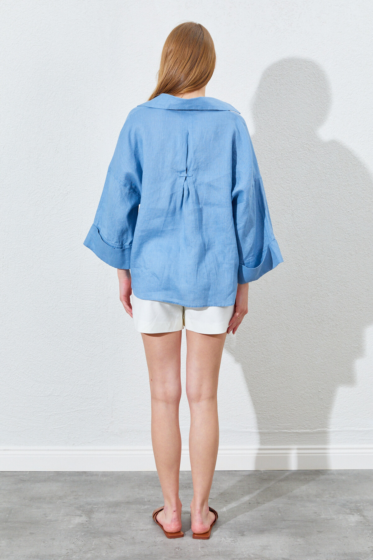 %100 Keten Kumaştan, Oversize Kesimli Ve Dökümlü Yapıda Kadın Gömlek - Bebe Mavi | Mkes169722-1