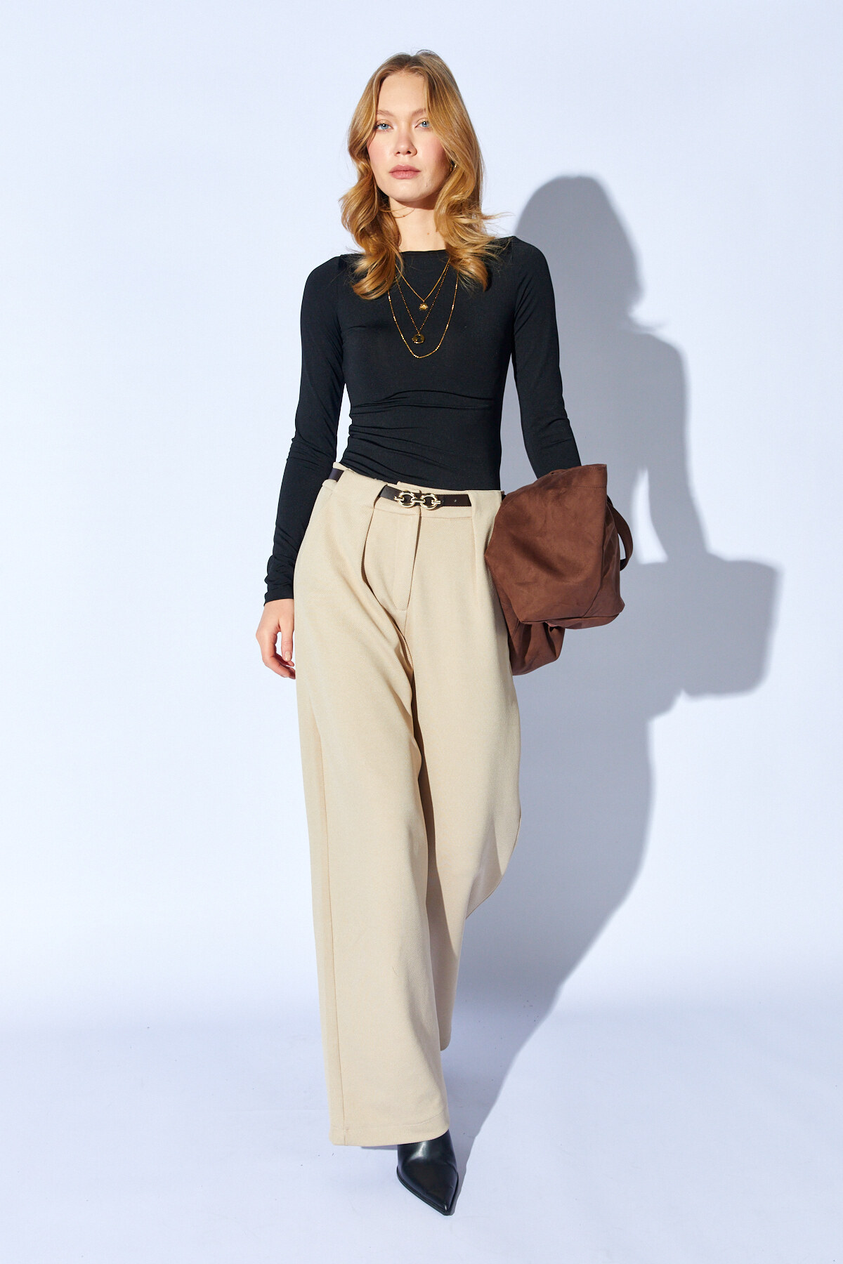 Bej İçten Kemerli Pileli Yün Efekt Palazzo Pantolon | MKW669832-01