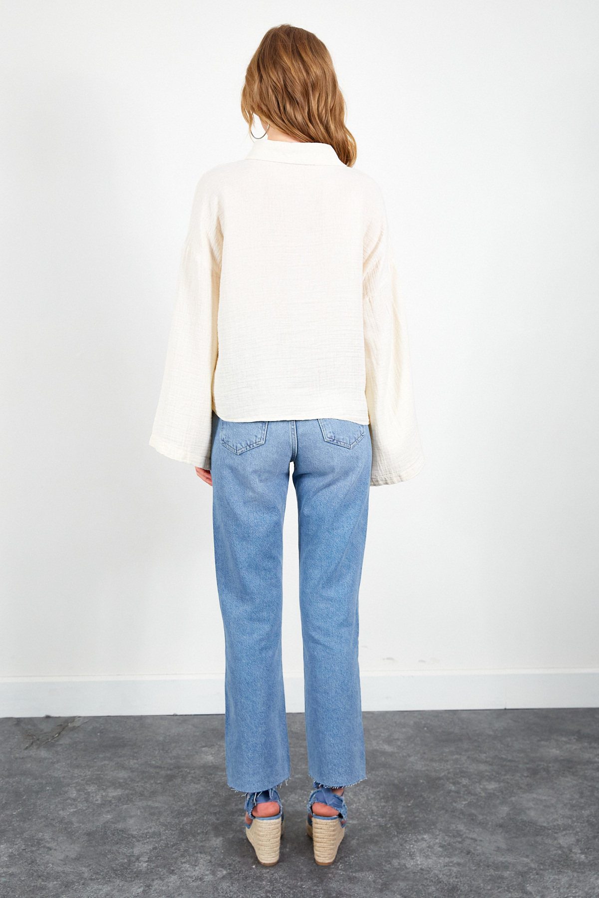 Kolları Salaş Yıkamalı Müslin Oversize Rahat Kalıp Kadın Basic Gömlek - Bebe Mavi | MKS166881-01
