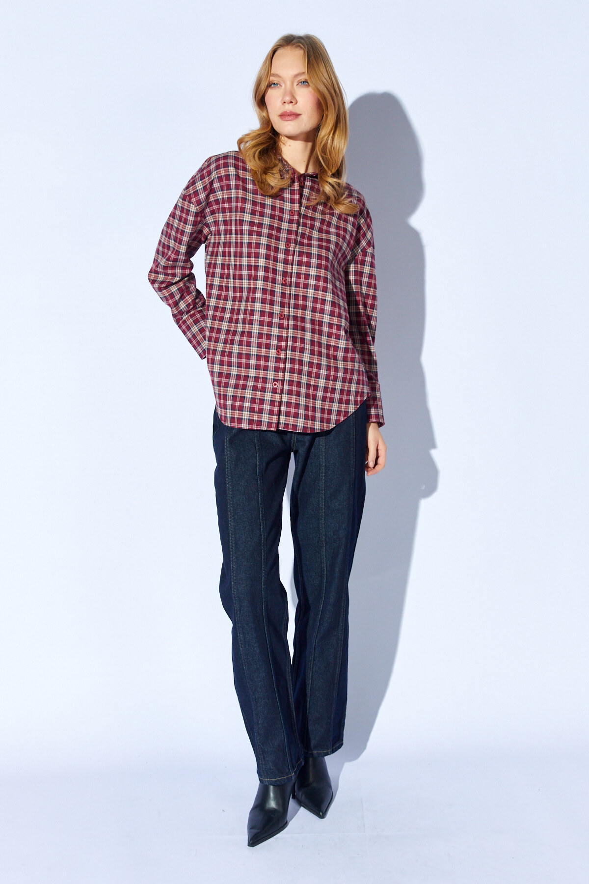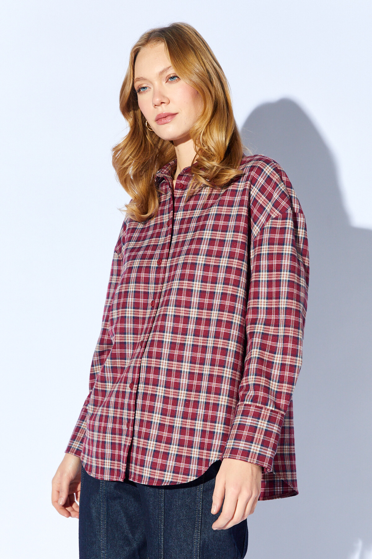 Bordo Ekose Desenli Oversize Gömlek | MKS1610714-1