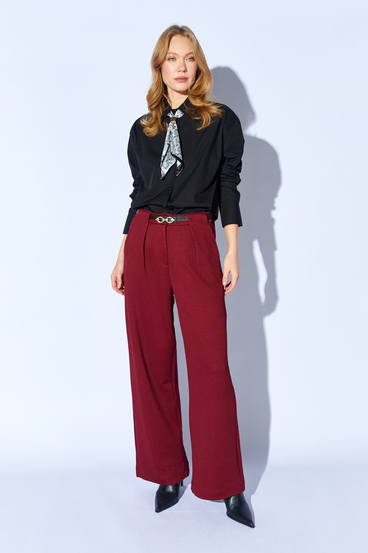 Bordo İçten Kemerli Pileli Yün Efekt Palazzo Pantolon | MKW669832-01