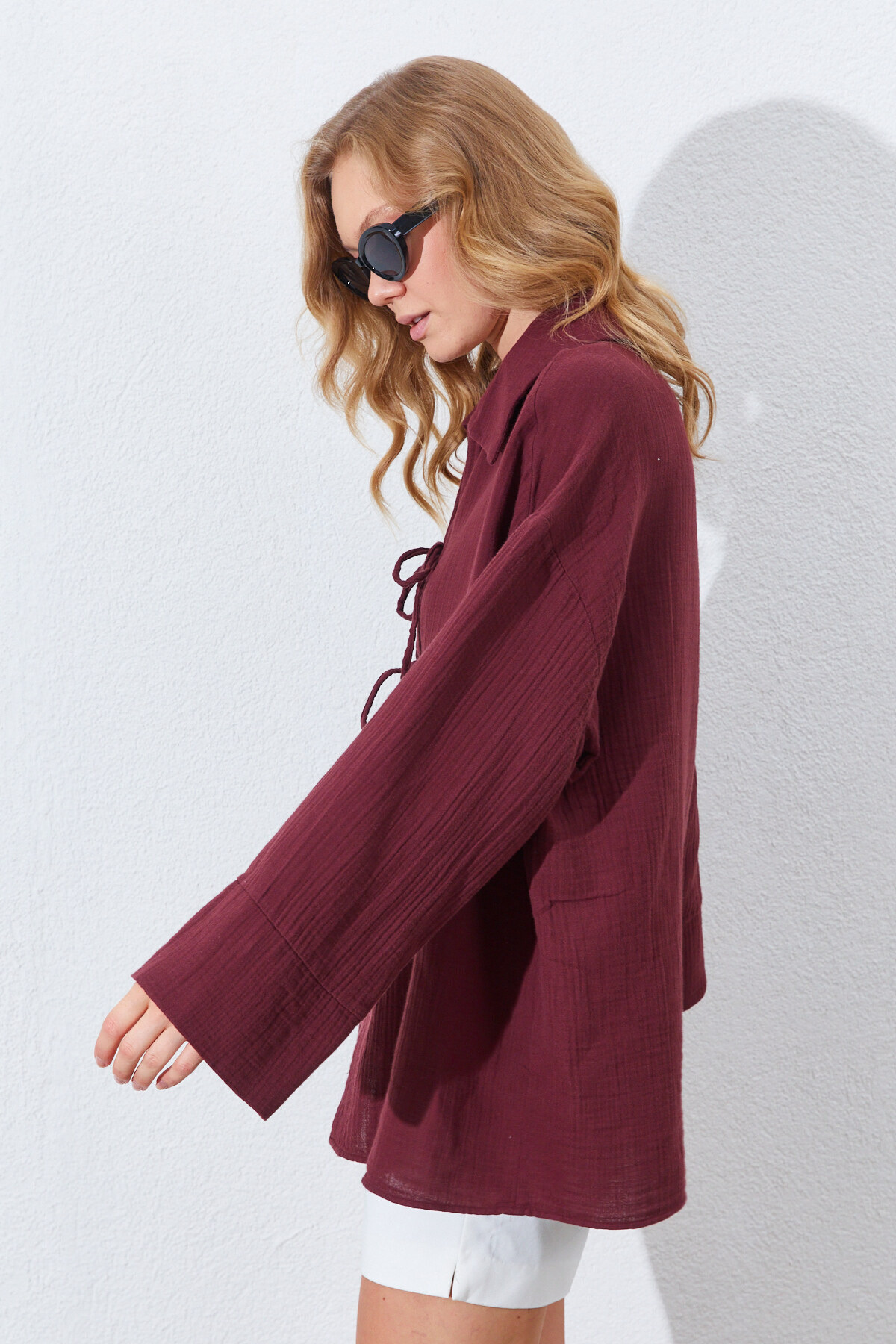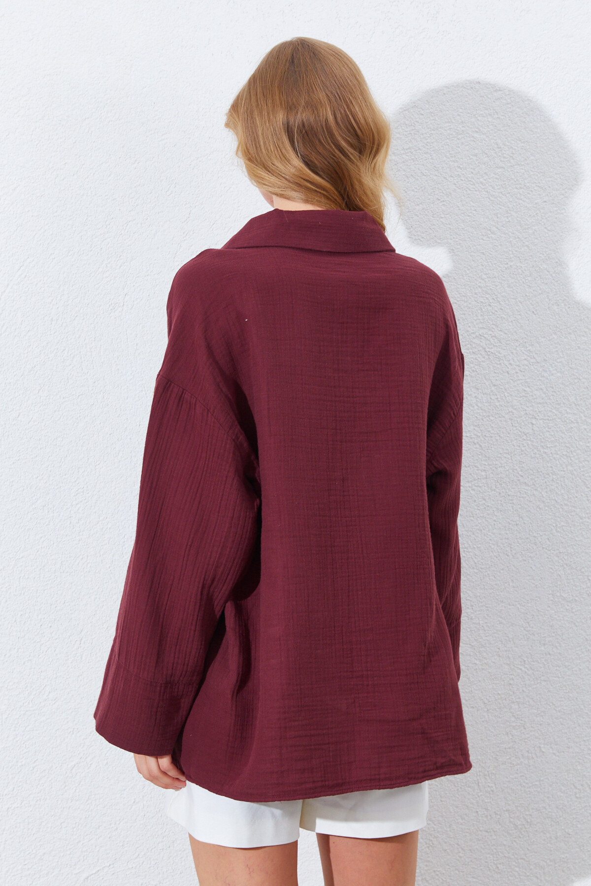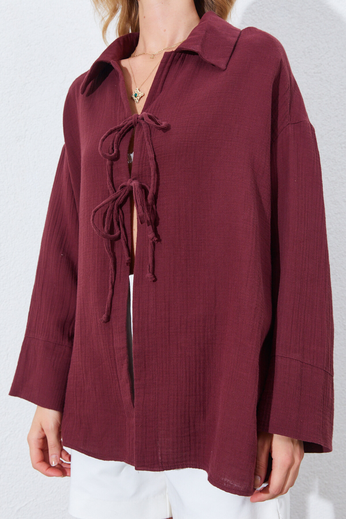 Müslin Doğal Pamuk Bağlamalı Kimono Gömlek | Bordo MKS161023-01