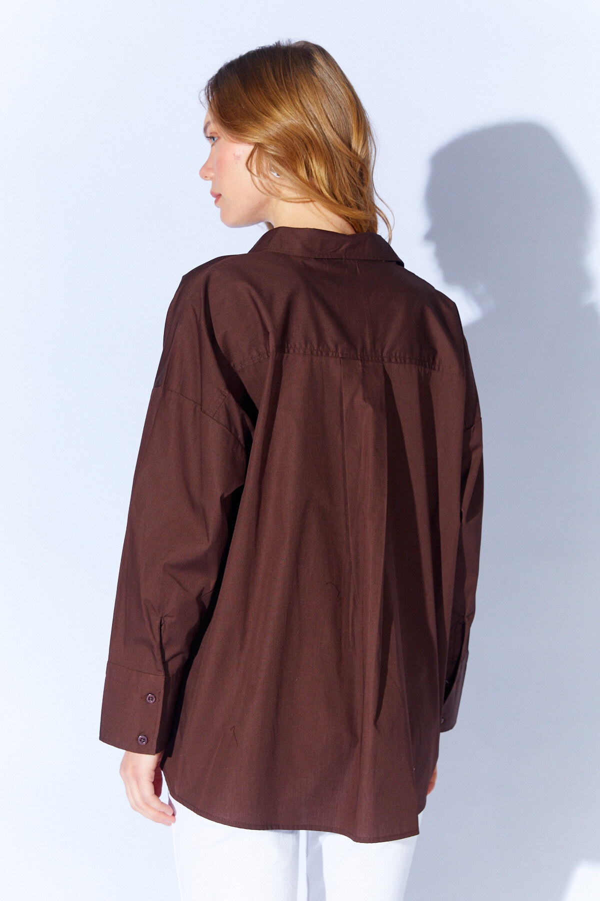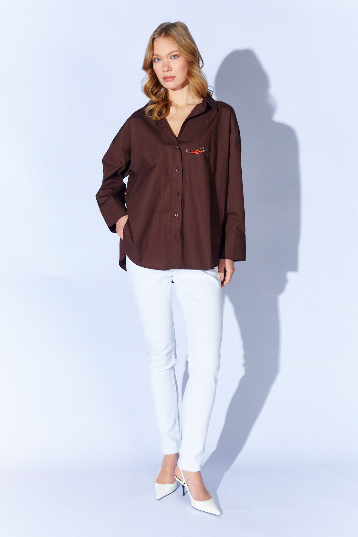 Broş Detaylı V Yaka Poplin Gömlek - Kahve| MKS1610532-1