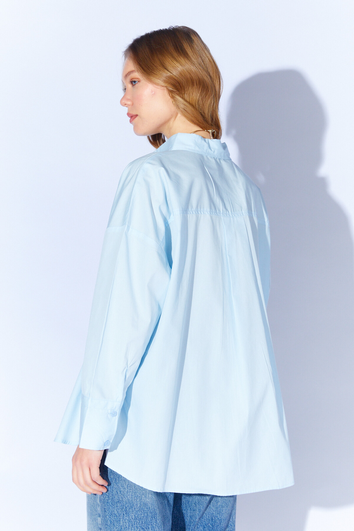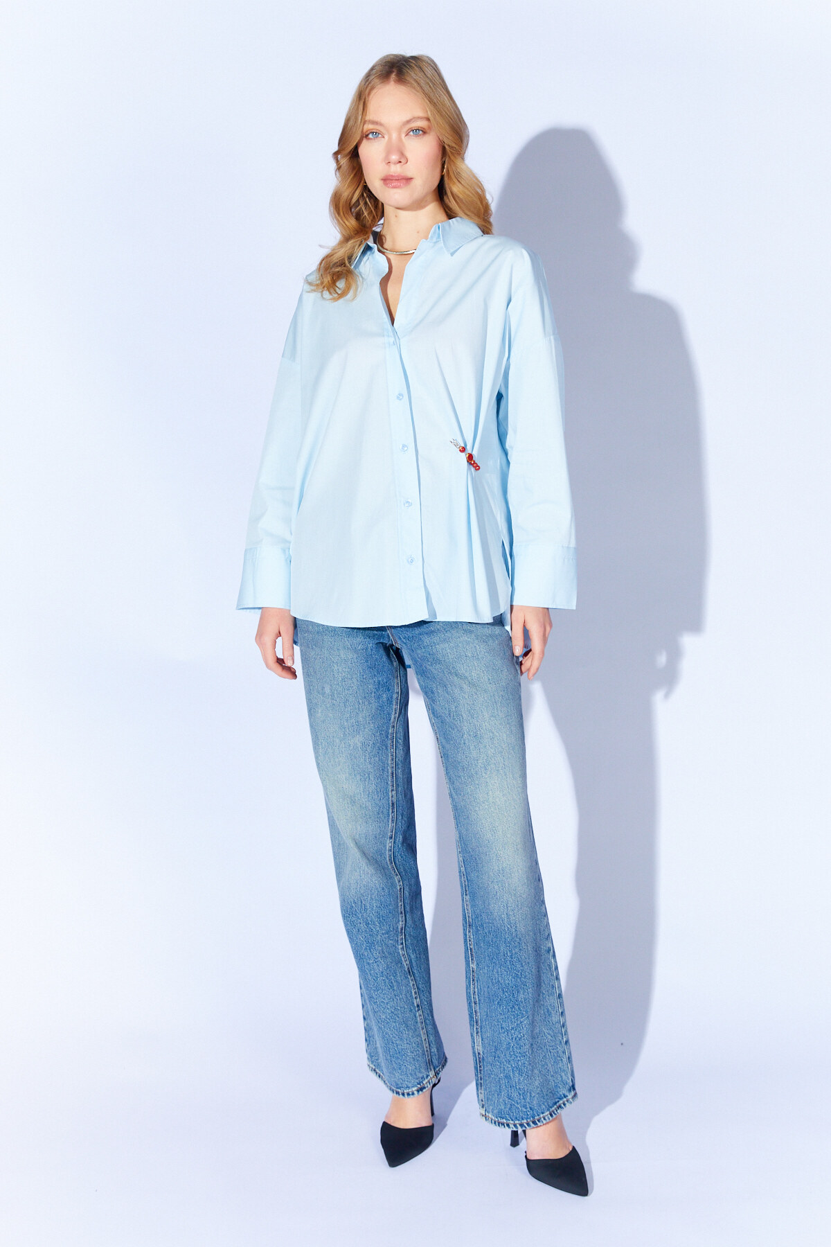 Broş Detaylı V Yaka Poplin Gömlek - Mavi| MKS1610532-1
