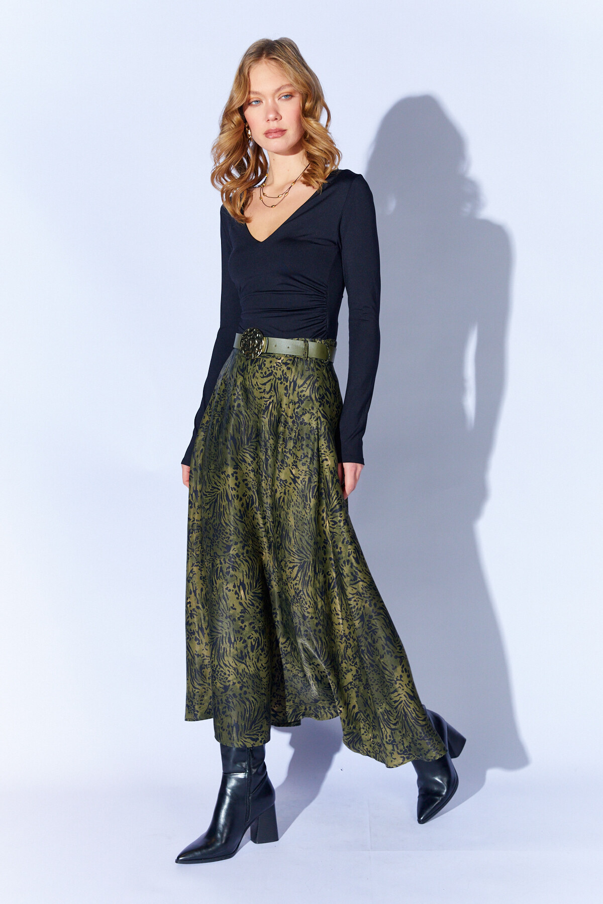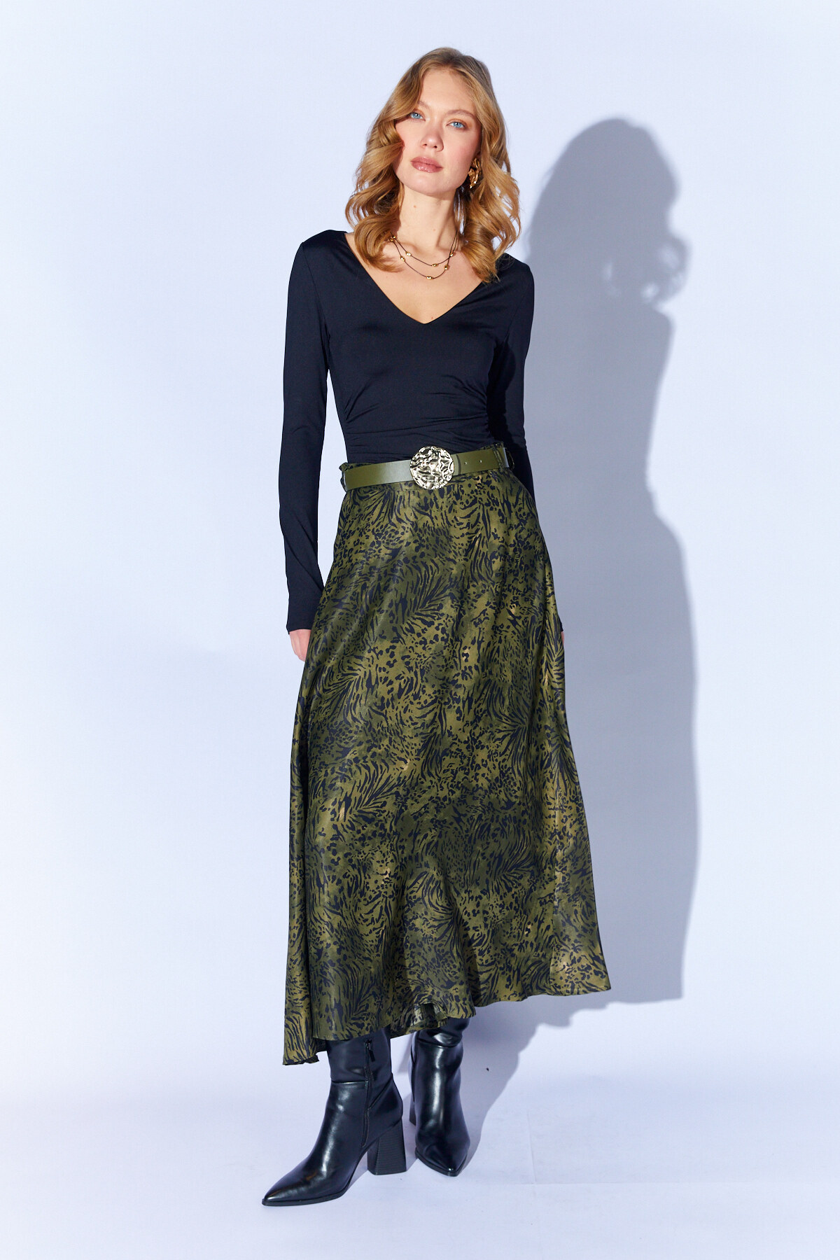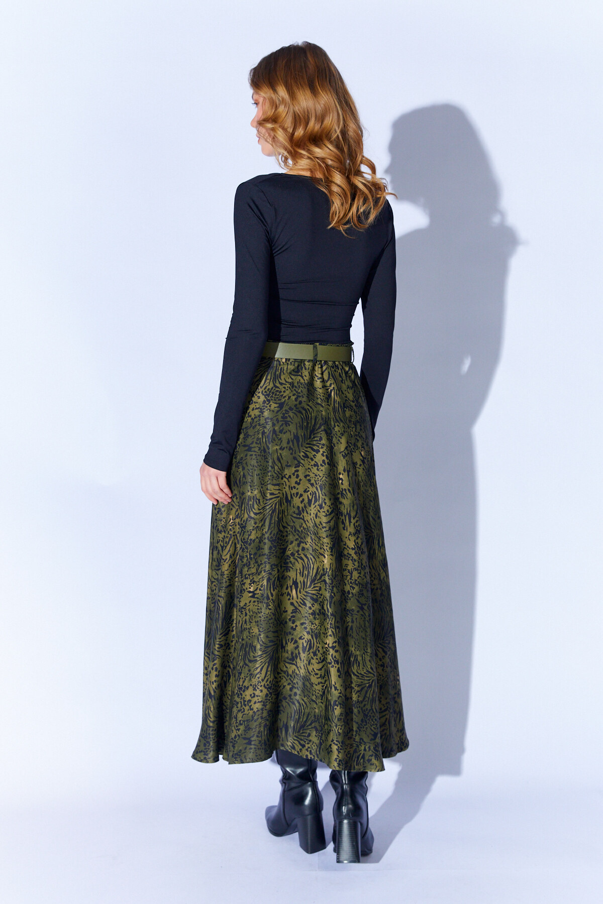 Desenli Yeşil Kemer Detaylı Saten Etek | MKS2910743-1