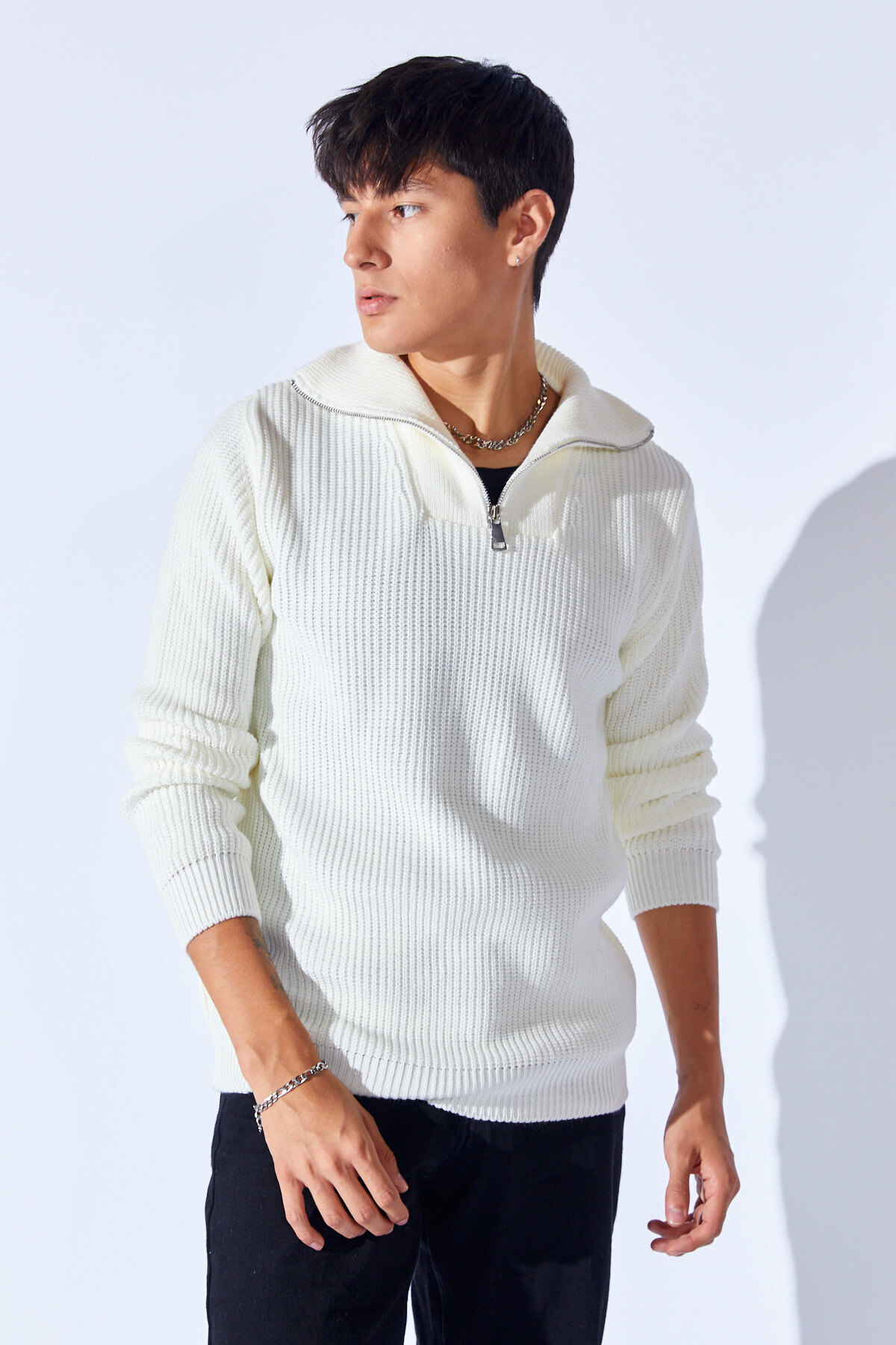 Ekru Oversize Yarım Fermuarlı Örgü Desen Yumuşak Dokulu Erkek Kazak | MANW519913-1