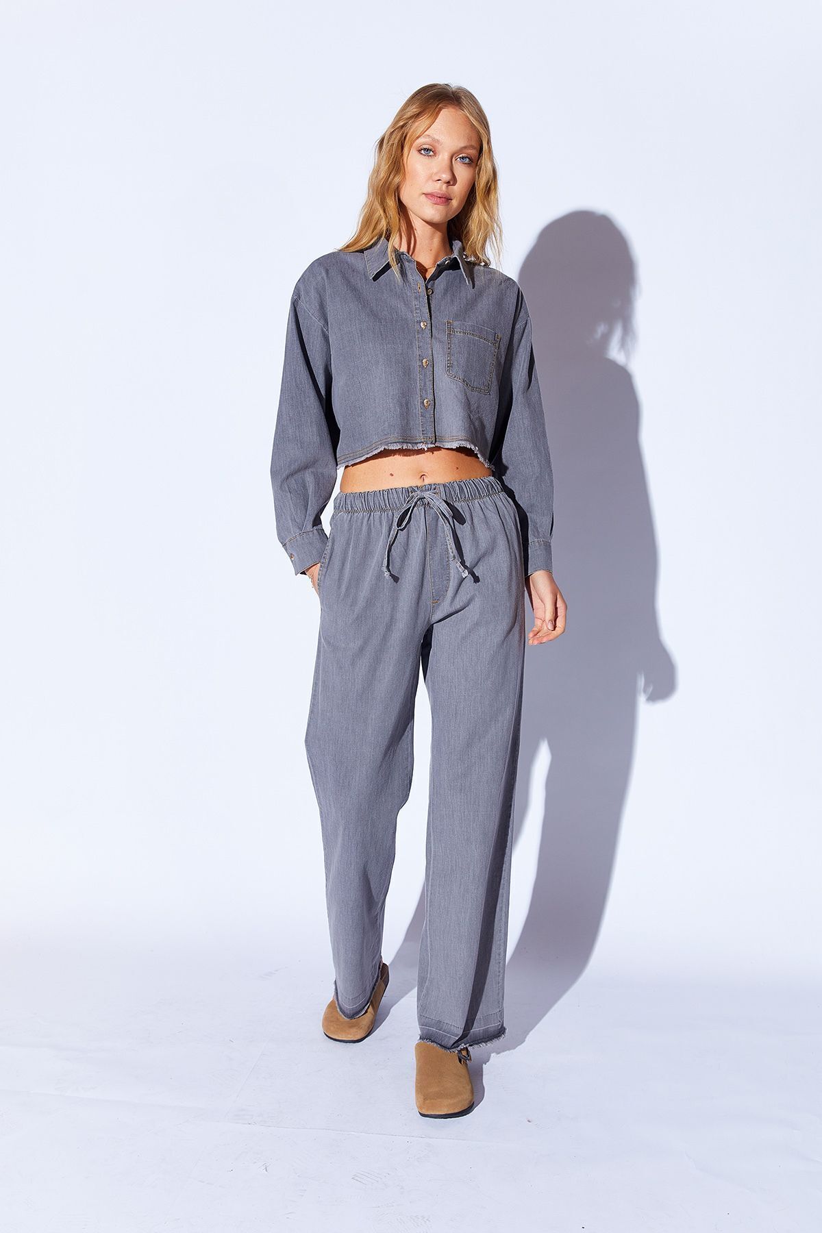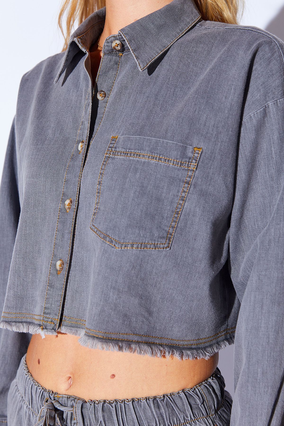 Gri Crop Soft Dokulu Denim Yıpratma Detaylı Kadın Jean Gömlek | MKS169600-01