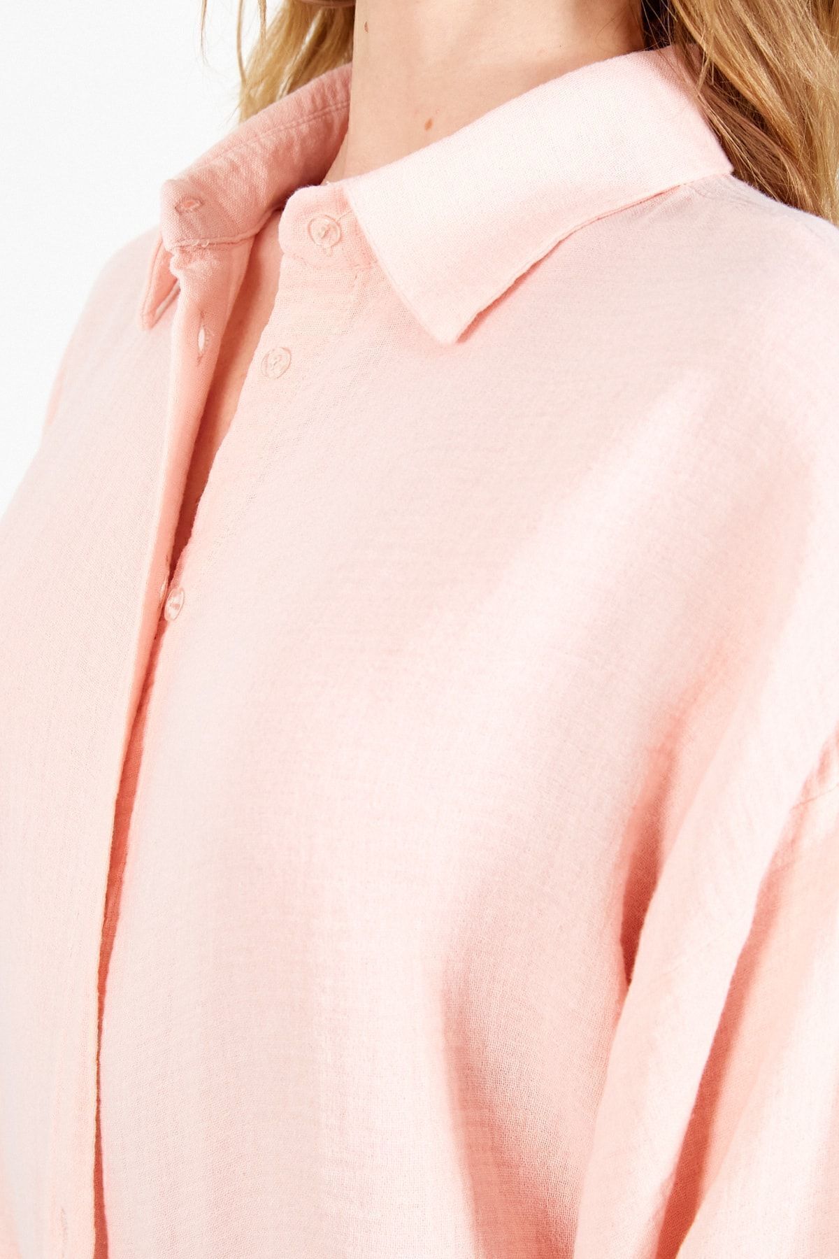 Kolları Salaş Yıkamalı Müslin Oversize Rahat Kalıp Kadın Basic Gömlek - Pembe | MKS166881-01
