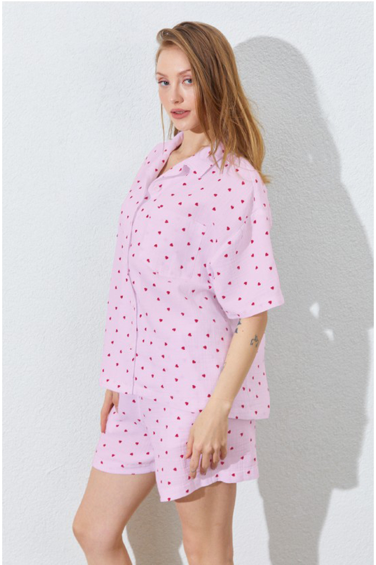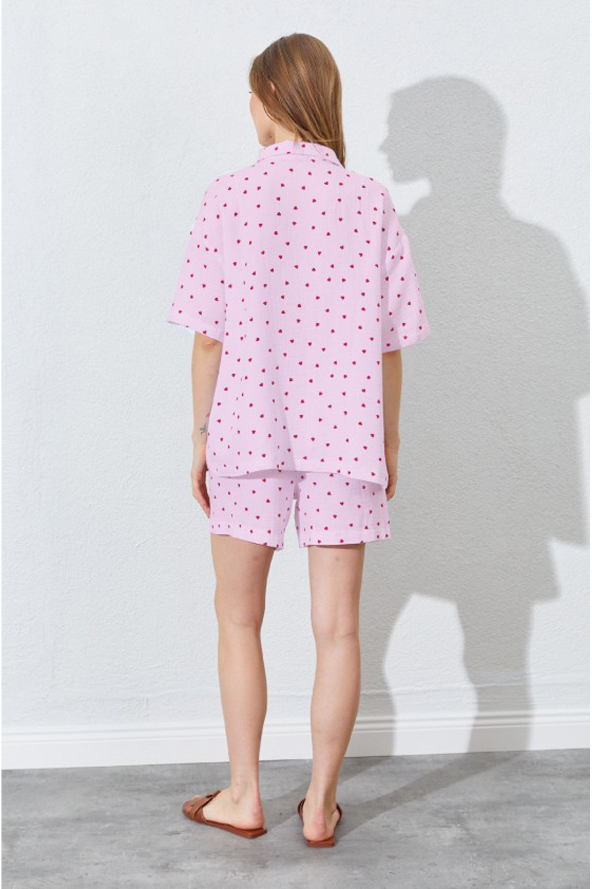 Pudra Apaş Yaka Gömlek Ve Cep Detaylı Şort Müslin Kalp Desenli Yıkamalı Şort Takım I MKS181373
