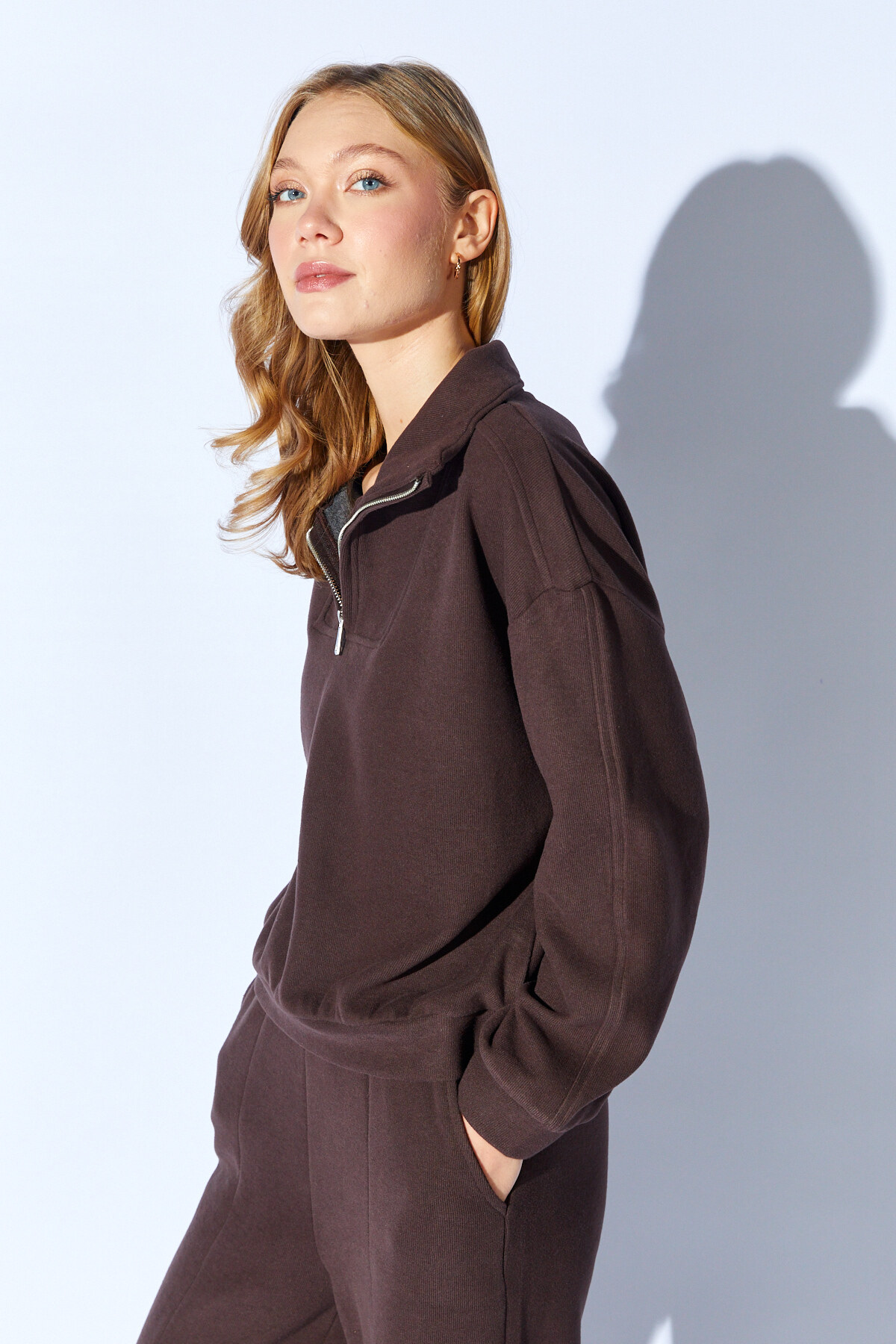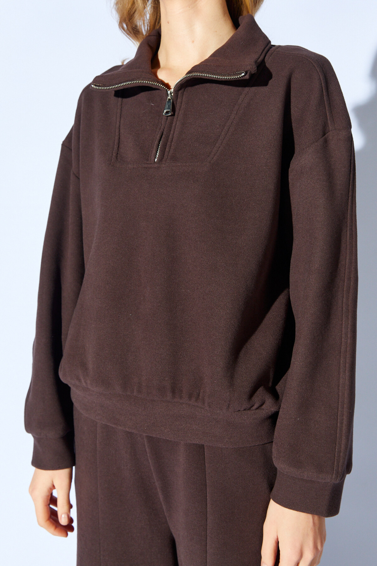 Kahve Yarım Fermuarlı Sweatshirt-Beli Lastikli Kordon Detaylı Pantolon Takım | MKW185498-01