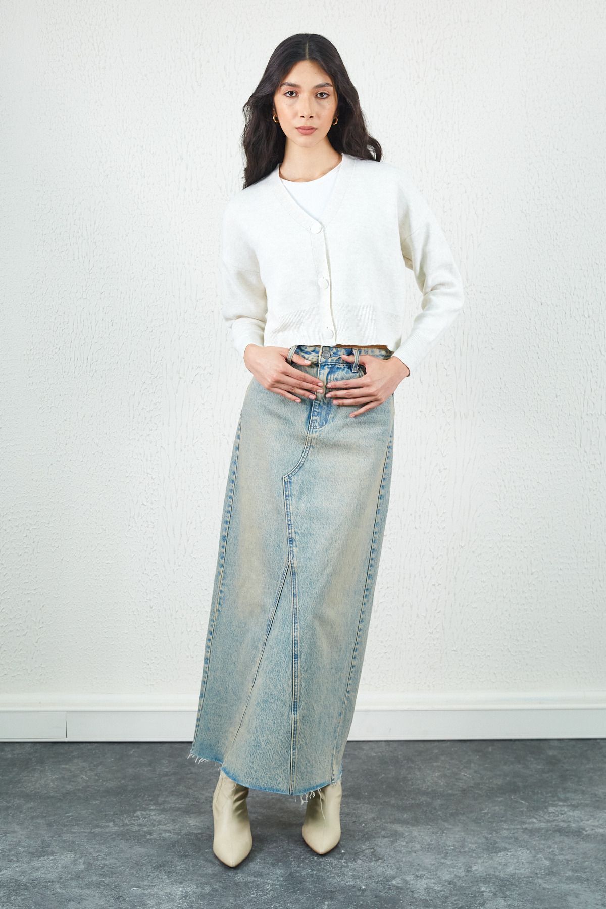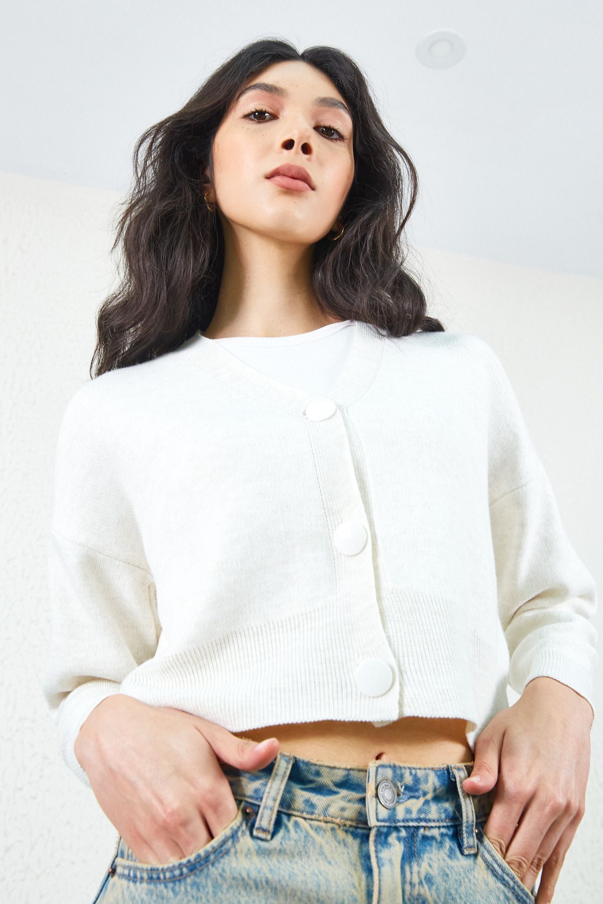 Yakası Gold Düğmeli Reglan Kol Oversize Kadın Kazak - Kemik | MKW535253-01