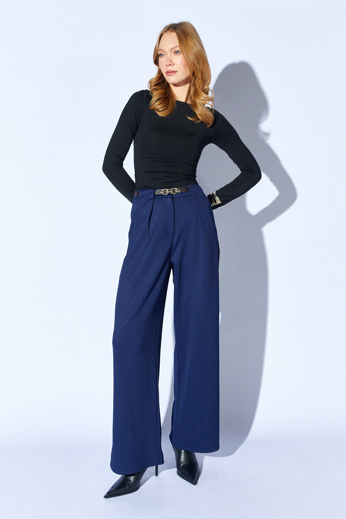 Lacivert İçten Kemerli Pileli Yün Efekt Palazzo Pantolon | MKW669832-01