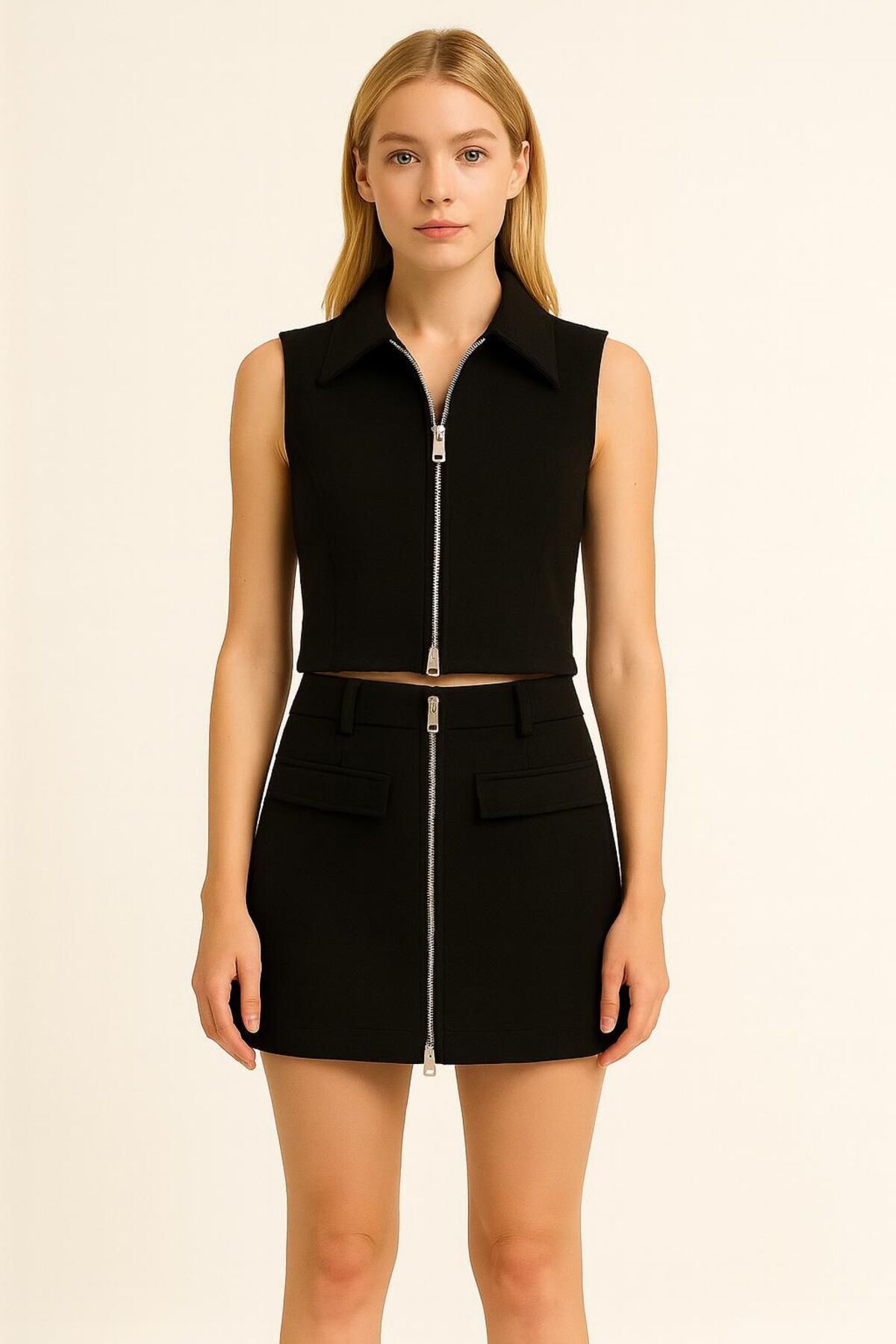 Siyah Fermuarlı Cep Kapağı Detaylı Mini Etek | MKW295656-01