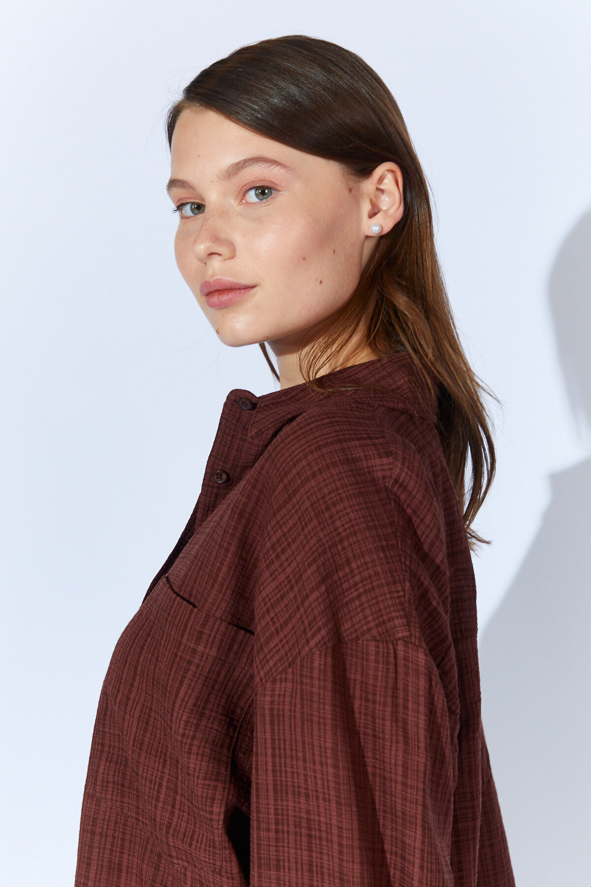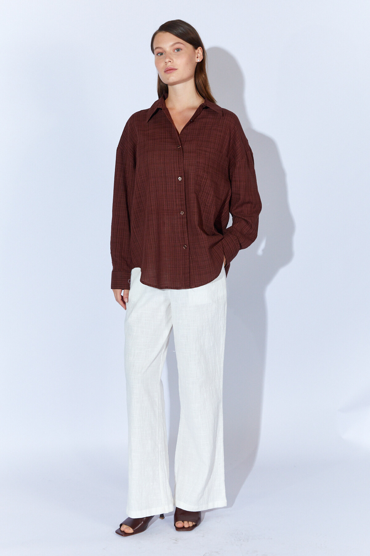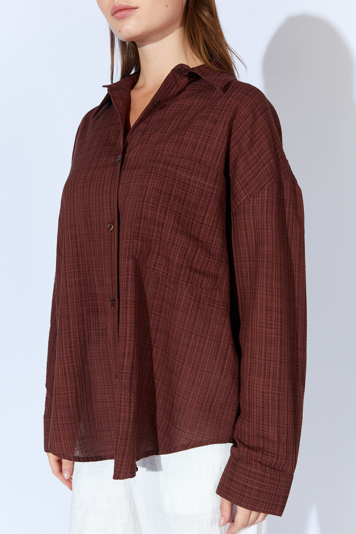 Viskon Keten Yıkamalı Soft Dokulu Kadın Gömlek | Kahve MKS1610013-1
