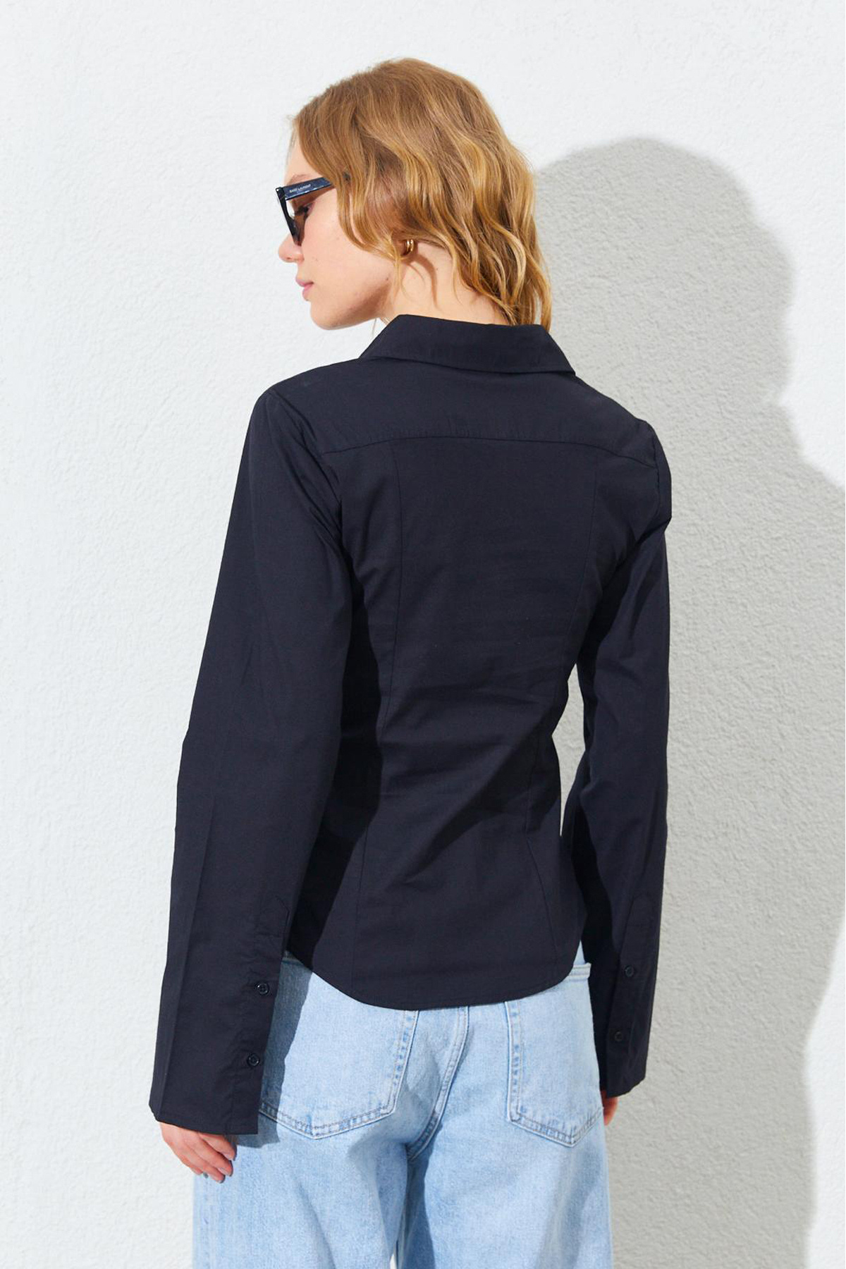 Bel Oturtmalı İspanyol Kol Lİkralı Pamuk Gömlek - Siyah | MKS161463-01
