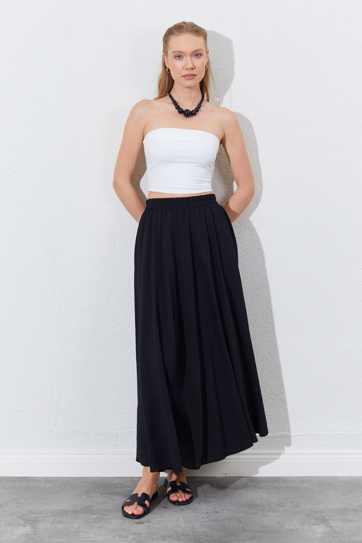Siyah Lastikli bel, dökümlü ve rahat kesim uzun kadın etek | MKs294906-01