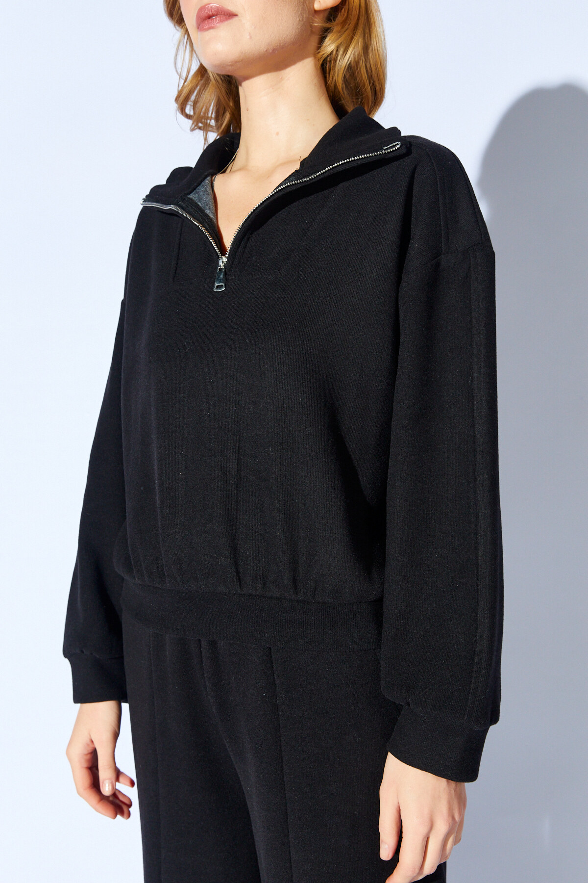 Siyah Yarım Fermuarlı Sweatshirt-Beli Lastikli Kordon Detaylı Pantolon Takım | MKW185498-01
