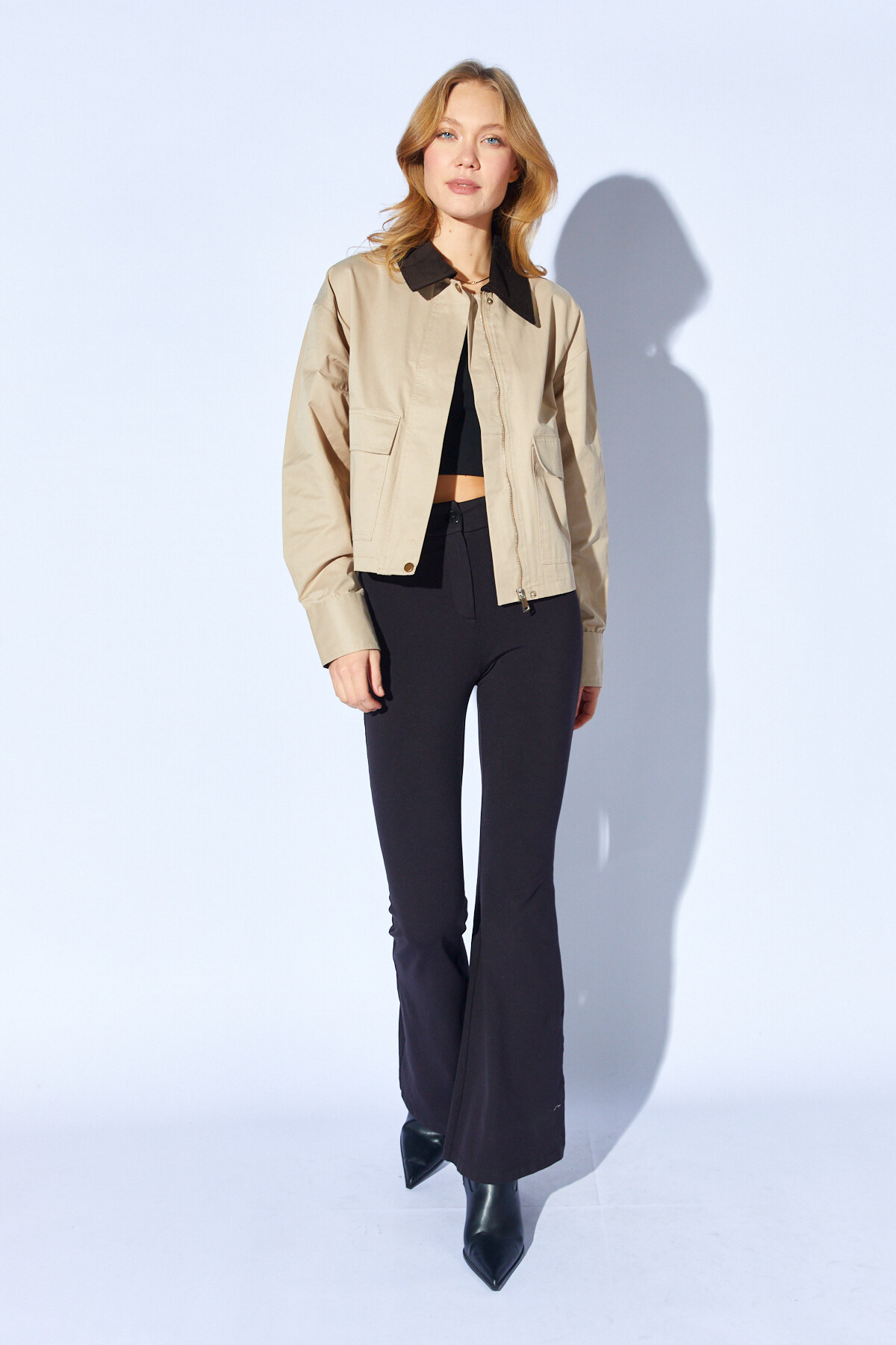 Haki Yaka ve Manşet Kadife Garnili Kısa Trençkot | MKW351518-01